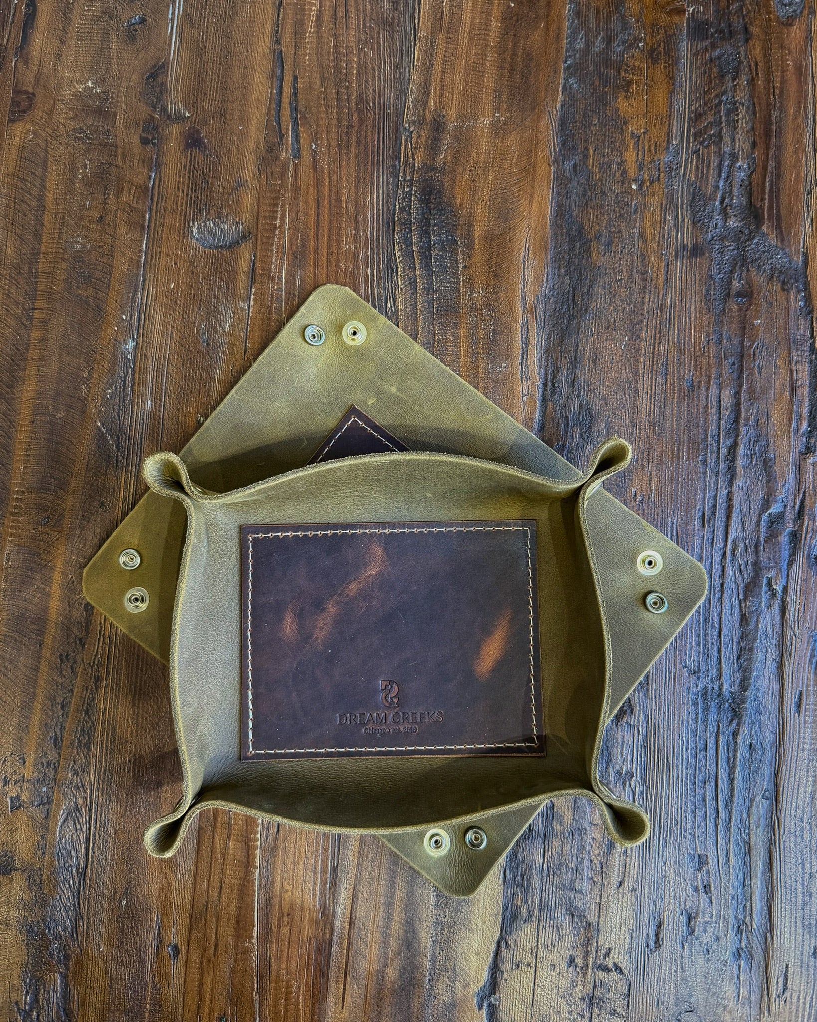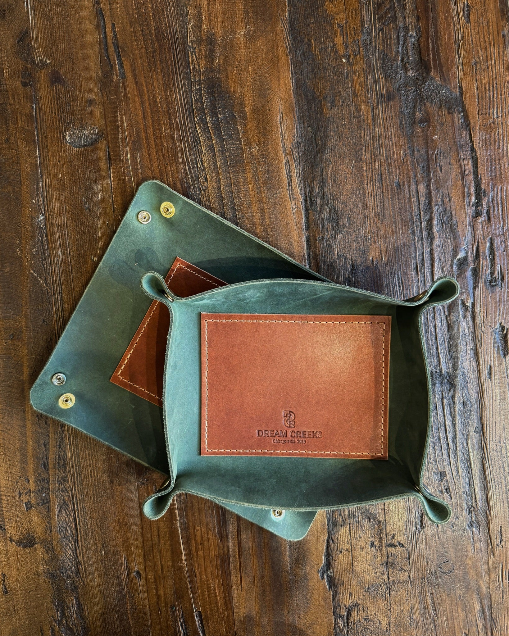 Ideal for travel or on a counter/console table, these trays are designed to unsnap and lay flat when not in use. Considered a perfect "catch all". Crafted with the highest quality leathers from the Horween Leather Company. With the addition of the inner leather insert, these trays are designed to be both durable and statement pieces.